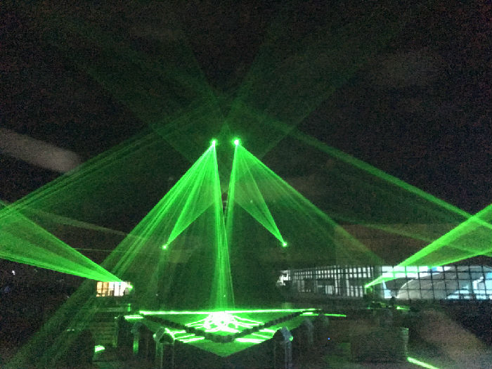 贵州省贵阳市平塘(世界最大射电望远镜所在地)科技小镇户外激光。此项目采用镭博激光(www.lb-laser.com)6台绿色地标激光。激光设备安装平塘县克度镇天文体验馆广场。开园仪式中,习主席发来贺电,刘延东总理及贵州省委领导出席了并参加晚会。8台激光和500多台光束灯同台表演,配合舞台节目,为海内外天文科学家带来一场视觉盛晏。舞台效果演出非常成功,庆功宴中得到平塘县委书记的表扬。