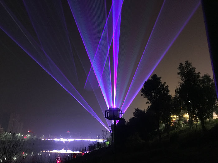 湖南省怀化市舞水河西岸亮化工程。本项目由镭博激光(www.lb-laser.com)在众多供应商PK胜出。采用镭博激光15台大功率户外彩色激光系统。540度大角度激光(镭博激光独有的540度旋转专利技术),安装在怀化市高新区舞水河西岸2公里的河道岸边。整个河道亮化,300多台光束灯,15台大功率户外彩色激光,100多台图案灯,把舞水河西岸装扮成一个大秀场。周未及节假日定时表演,吸引了众多市民观看,给市民休闲提供了一个好场所。