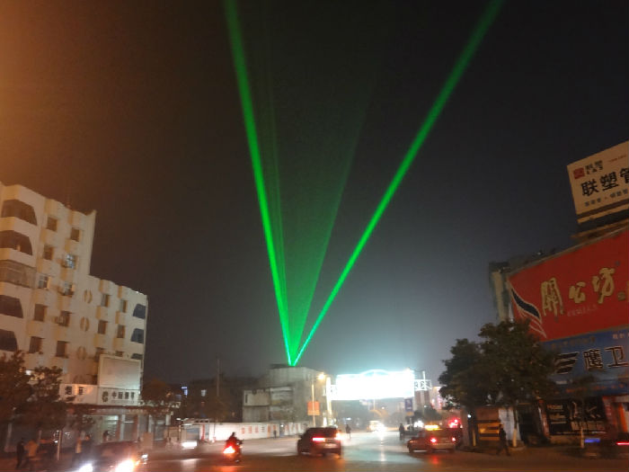 概况:大功率绿激光空中扫描系统,集激光应用技术、计算机图像处理技术和超高速振镜控制技术于一体,将纯正、炫丽的绿激光在城市上空变幻出动态的线、面、旋转体及任意编辑的图形、文字。静,如定海神针;动,则流光溢彩,视觉效果强劲、震憾,具有王者风范,是都市标志性建筑、著名景区的点睛之“笔”,也是广告宣传、大型舞台晚会及城市亮化工程中高品位的象征。在城市高层大厦顶端,用大功率固体激光器进行全方位的扫描。可以在数公里以外观赏到独特的激光夜景。通过激光系统以强烈炫目的绿激光束不断探射在夜空中,可平行直射、旋转放射、有节奏的变换光束方向,使该建筑物成为城市中耀眼的地标及独特的城市夜景。激光地标根据其工作特性分为“投射型激光地标”和“表演型激光地标”两种。 系统安装在建筑物顶端,投射型激光地标:激光束经过光学发射器长距离投射,其特点是:在晴好天气,可在半径6到12公里以外看到激光束,(视所选用激光器的功率而定,比如:30瓦激光器可视半径为6公里以上,而50瓦激光器的可视半径达12公里以上。)换言之,可以看到激光束的圆形区域的直径为12至24公里,影响范围极大。而且激光的色彩纯正,光束扫描过程庄重,有“一览众山小”的王者风范。表演型激光地标:激光束经过高速机械扫描器发射,可以将单束激光束扩展成多束,在计算机光学系统的控制下,形成花样繁多的输出方式,可以实现多光束的翻滚、变幻,可以和音乐同步,可以在建筑立面、甚至云层上写简单的文字和图形,起到广告的效果,其娱乐性极强。产品现状:随着激光技术的成熟,激光水幕和激光地标的可靠性、维修便利性、电耗都有了大幅度的改善。比如激光地标,在正常工作条件下,10000小时为极低故障期。以每天工作3小时计,,电耗低于5千瓦。风冷10w-40w水冷10w-60w 户外激光灯、户外镭射灯、户外地标激光灯、地标激光灯的核心部件为高功率激光器,激光具有方向性强、单色性、相干性强,激光地标正是应用了上述特性。其在城市景观亮化的作用是不可比拟和替代的。